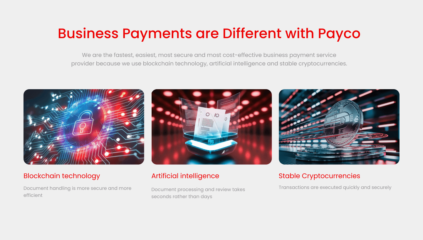 Payco are digital technology experts, create innovative payment systems. payment systems are built using blockchain technology and artificial intelligence (AI) Imagine being able to deliver immediate payments to anywhere in the world with complications or conditions taken care of all with no fuss or delays, at rock-bottom prices and with extra security.